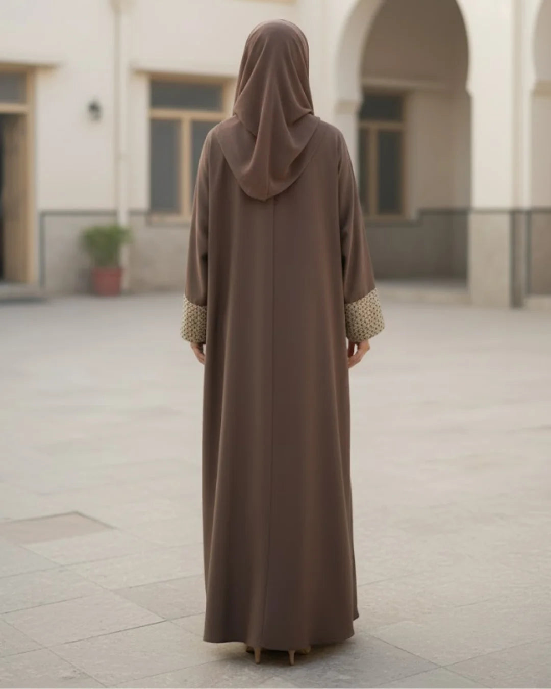 Bring a touch of artistry to your modest wear with the Brown Abaya featuring Geometric Patterned Cuffs, crafted from premium Nida fabric for a soft and elegant drape. The deep brown tone is beautifully highlighted by intricate geometric embroidery on the sleeves, offering a contemporary edge to a traditional silhouette. Designed as a closed abaya with a V-neckline and front zipper closure, it combines style with everyday convenience.